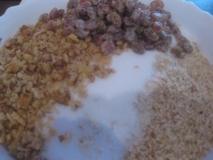 - Place nuts, strained raisins and sugar into a large bowl; stir until well blended