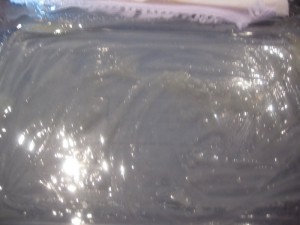 - place the first layer of phyllo in the Pyrex pan so that 1/2 of its surface area on one side is completely covered with butter, fold it in 1/2, with the buttered side in