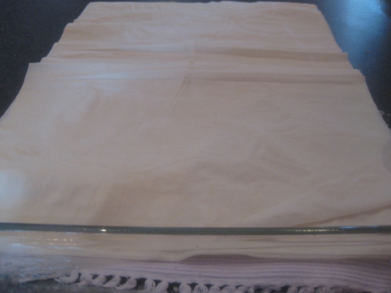 - Unwrap phyllo dough; place it opposite the pan
