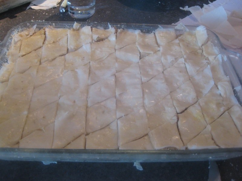 Cut the baklava ensuring a strong, clear, clean cut through to the bottom