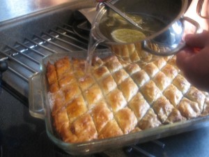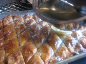 - When the baklava comes out of the oven, slowly pour the syrup over all parts of it