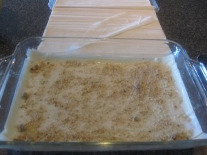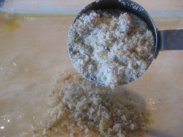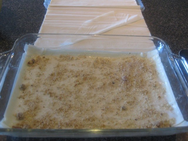 Add 1/4 cup of filling and about 1 tablespoon of breadcrumbs every 6 layers (3 pieces) of phyllo until the pan is full