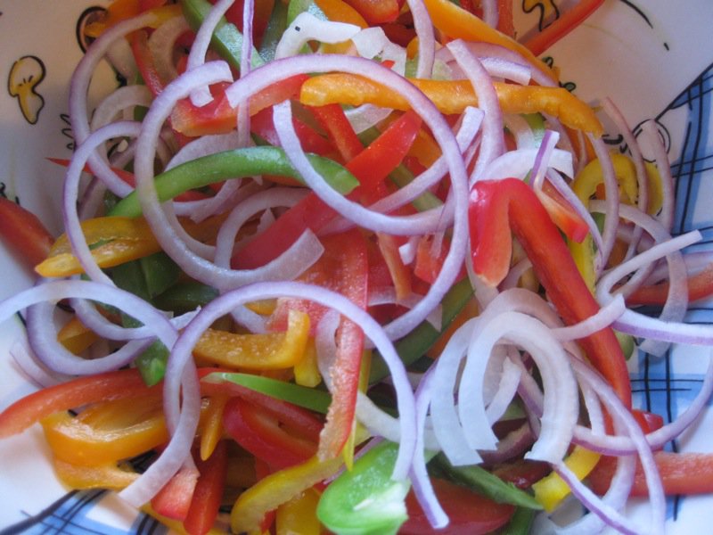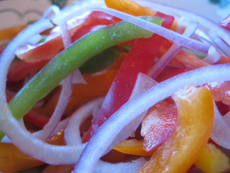 - 1 yellow, orange and green bell pepper, each thinly sliced