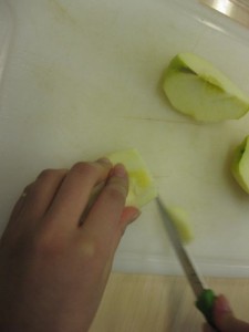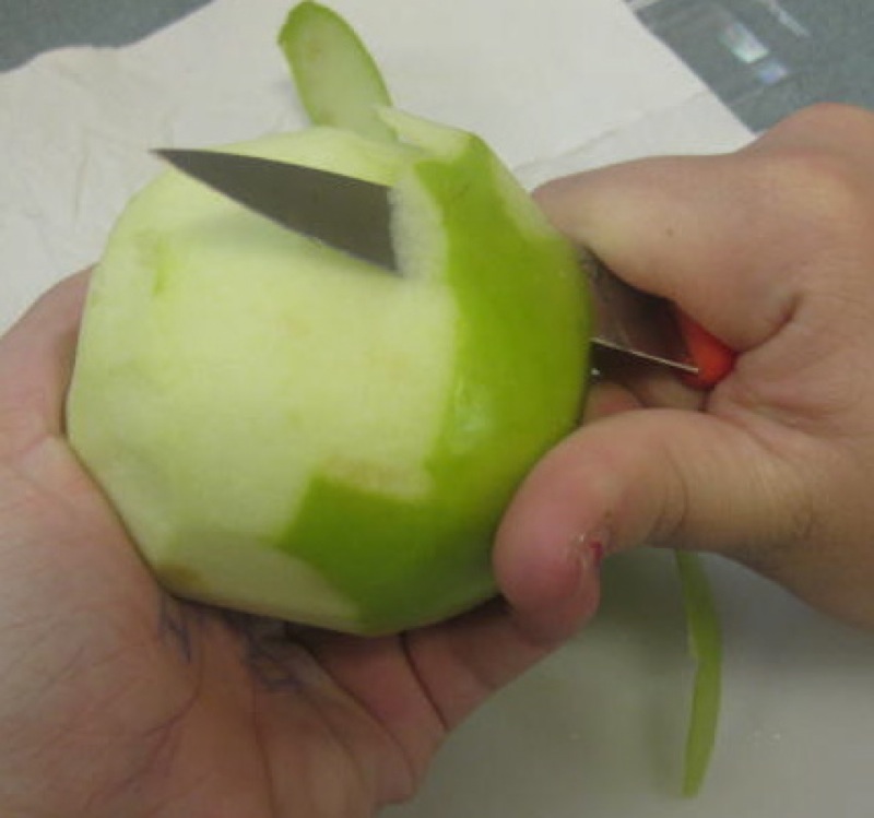 After a thorough washing of hands, and apples, the paper napkin was set out for the garbage. Garbage should never go on the cutting board. A bowl works well for this too. Then, the position of the knife hold was discussed.
