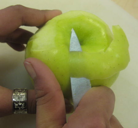 Here is another closer look of how to hold a quarter of an apple to use the knife to take out the core.