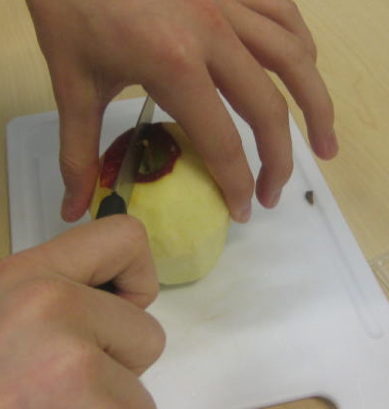 The student is holding the quarter of an apple properly in his hand. He is coring it carefully and then slicing it. The pressure he is using on the left photo is a pressure that will not cut his hand as he is holding the apple and resisting his knife with it.