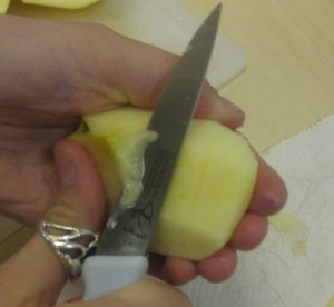 See below how high the hand is on the knife handle, and actually holding onto the upper part of the blade? This is necessary to have control of a paring knife for peeling an apple. The next critical aspect of the hold is the use of the thumb on the hand holding the knife. It must be on the apple, and guiding the cut, as on both above photos.