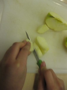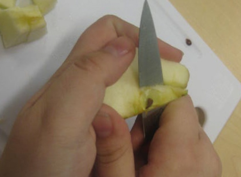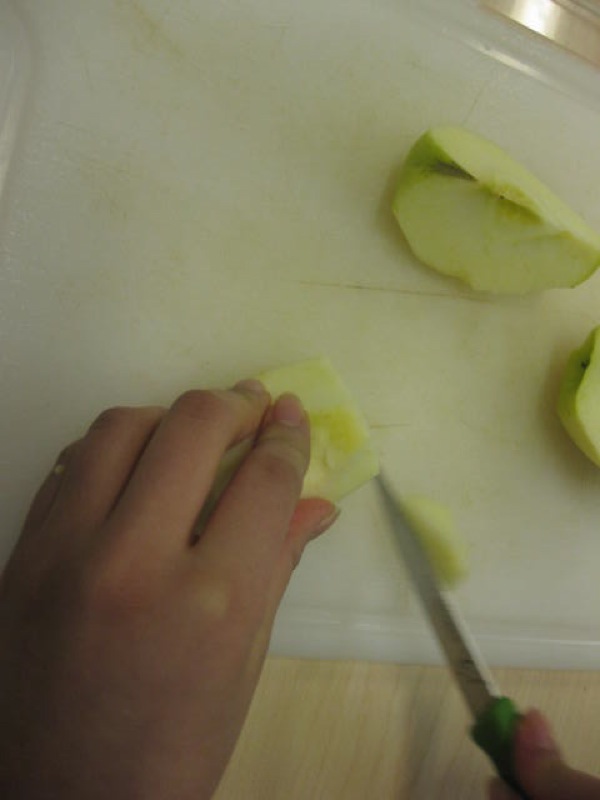 Holding your hand, as above, while cutting the apple is also important. You will not get hurt if you have a firm hold of the apple, and your knife under your hand.