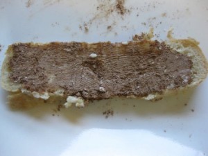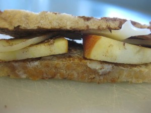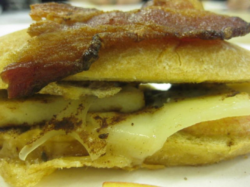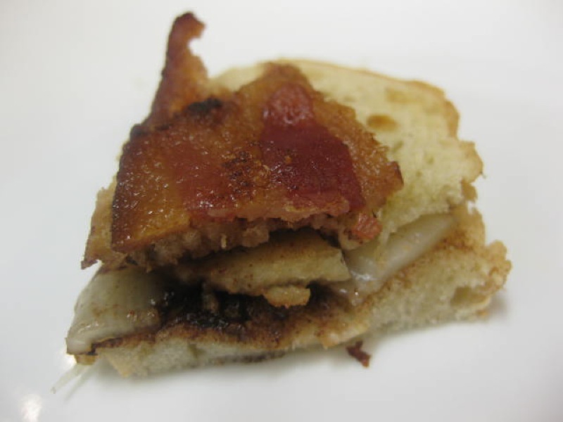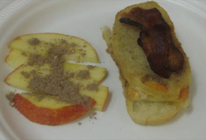 The highest scored teams from each round, oddly, tied. Below is the grade 7 winning sandwich: ciabatta bread, butter, a lot dark cocoa with a bit of cinnamon, Asian Pear, applewood smoked cheddar, and a bacon cracker on top. The judges were unduly smitten with this one both days. No one could taste chocolate, but there was something substantially different that carried the cinnamon flavour through this savoury bite.