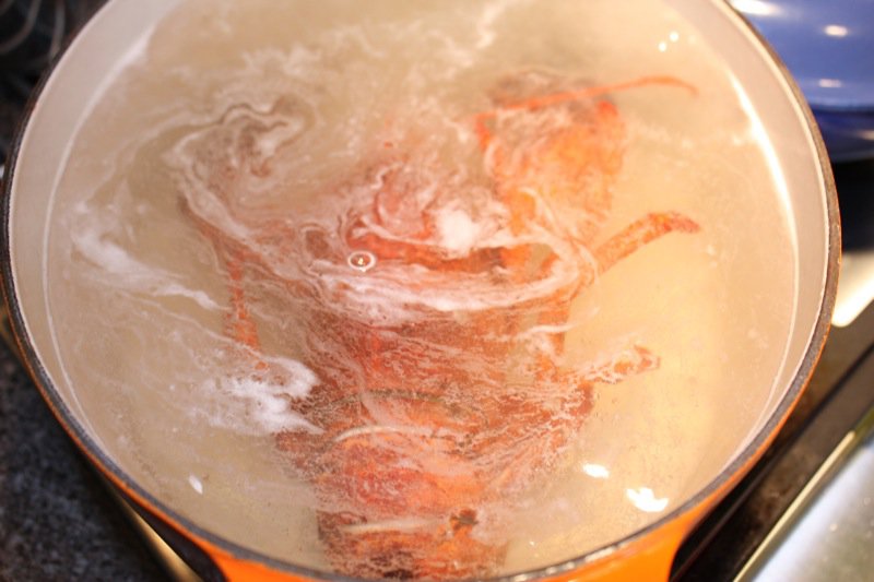 I had cooked lobster many times before, but never a fresh one. I wasn’t intimidated. I was just concerned that I didn’t over cook it, or under cook it. I had 4.2 kilo of lobster and knew that the water had to be at a hard boil before I put them in, and that I wasn’t to start timing the cooking until the water comes to a soft boil. I used a chart on how long to boil them as the instructions I found said it was done when the tentacles of legs were loose to a pull. Mine never were. The last photo above shows the water is beginning to heat again after plunging the lobsters in.
