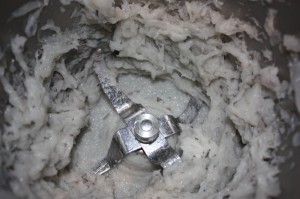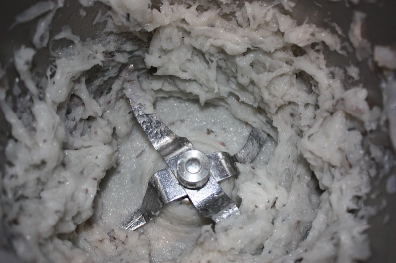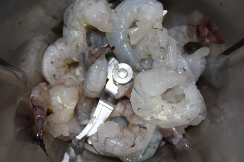 I cleaned, deveined, and removed the tails off of the beautiful black tiger shrimp. I scaled them into my Thermomix and whizzed them until they were a paste. This was part of the binding that was added to the lobster meat.