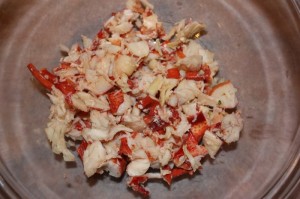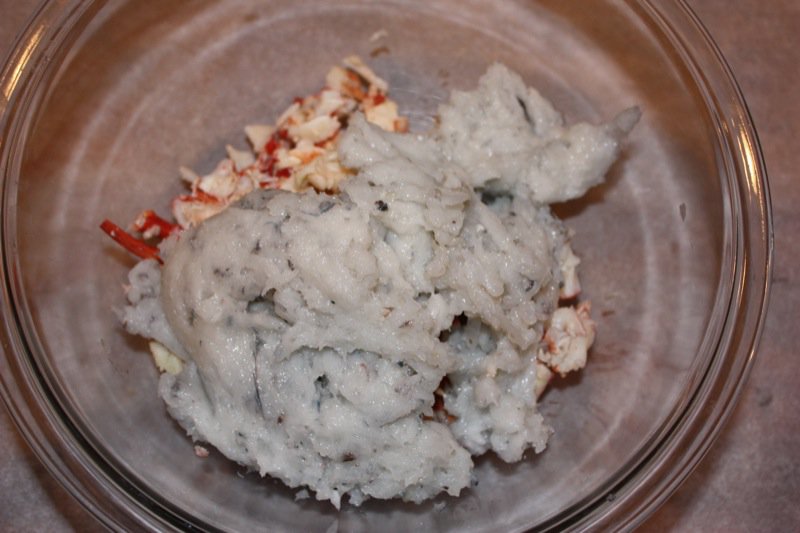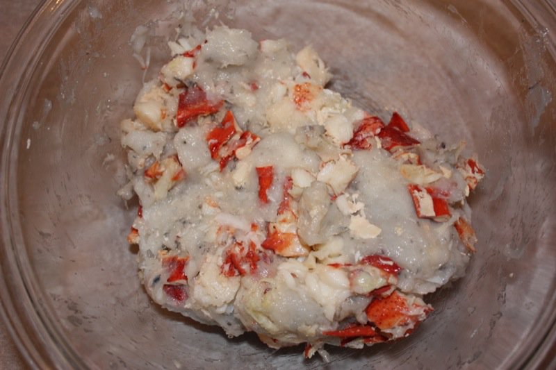 Between the two lobsters, I had 9 ounces of lobster meat: enough for three batches of Adjey’s recipe. I only had legs for two batches, so I just made a set of the balls without their artisan appendages.