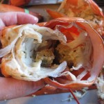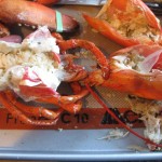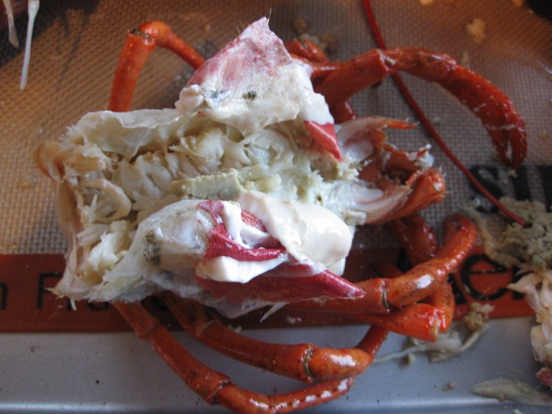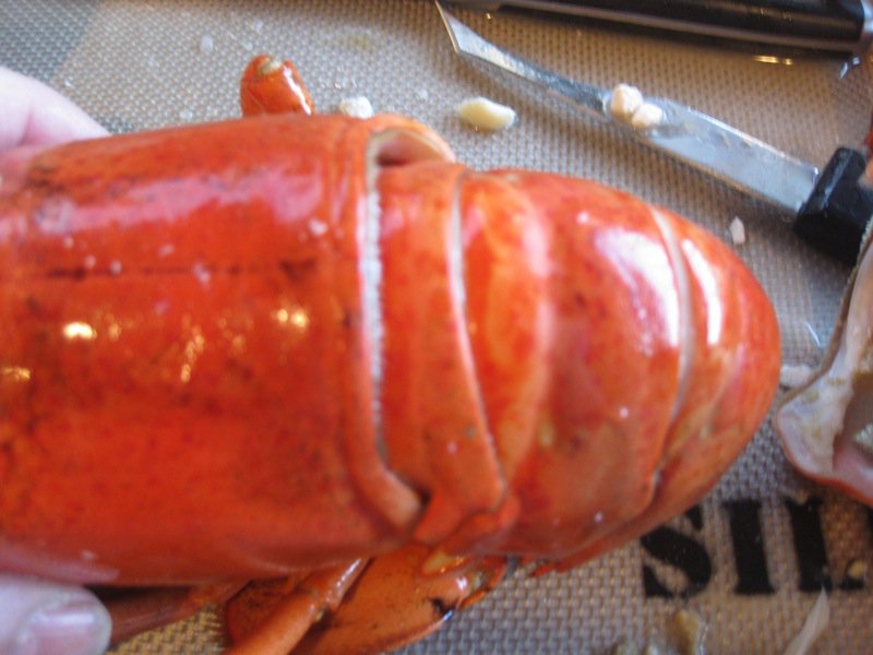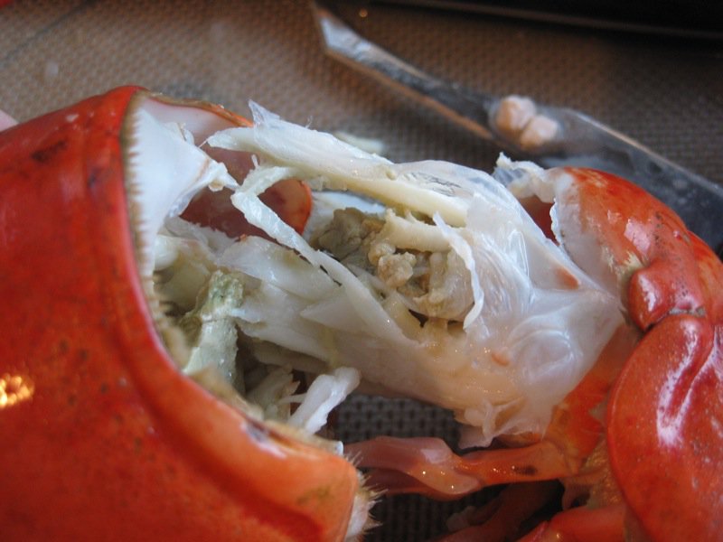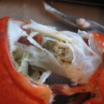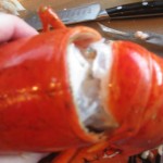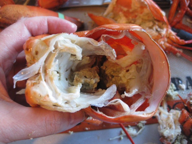 Turn the lobster over, and bend the tail off of the body. It pulled away revealing the the greenish substance you see, called the “tomalley” or liver, inside of its body. Many consider it a delicacy. I thought it was delicious.The tail is gone, so there is the body and the claws left.