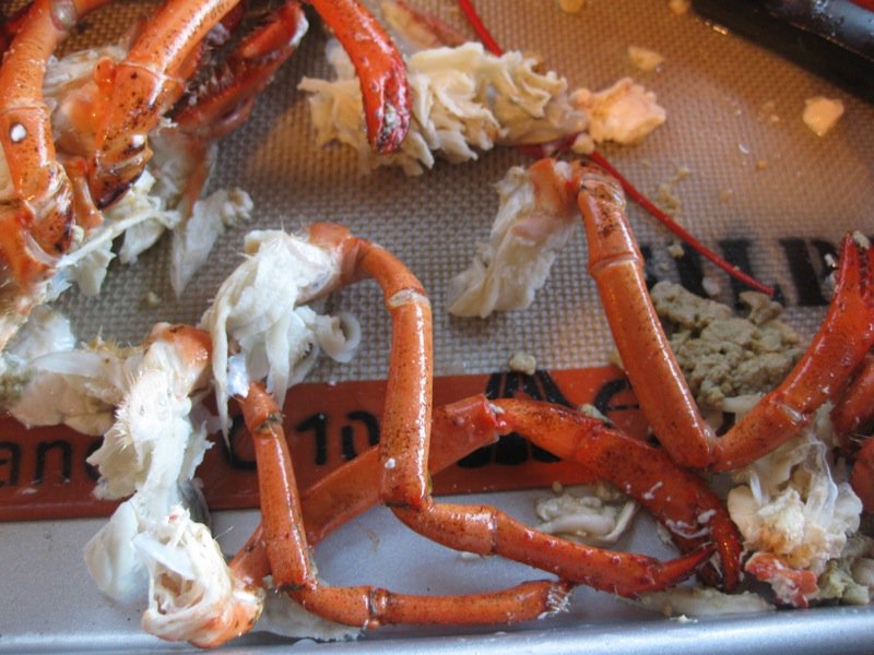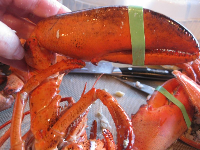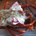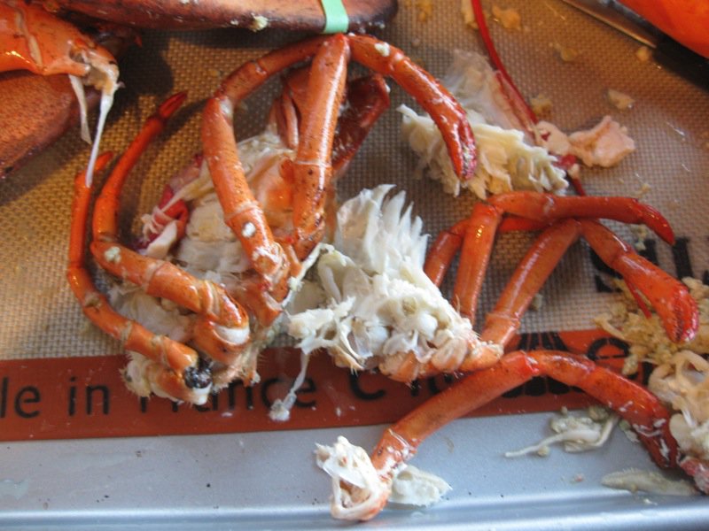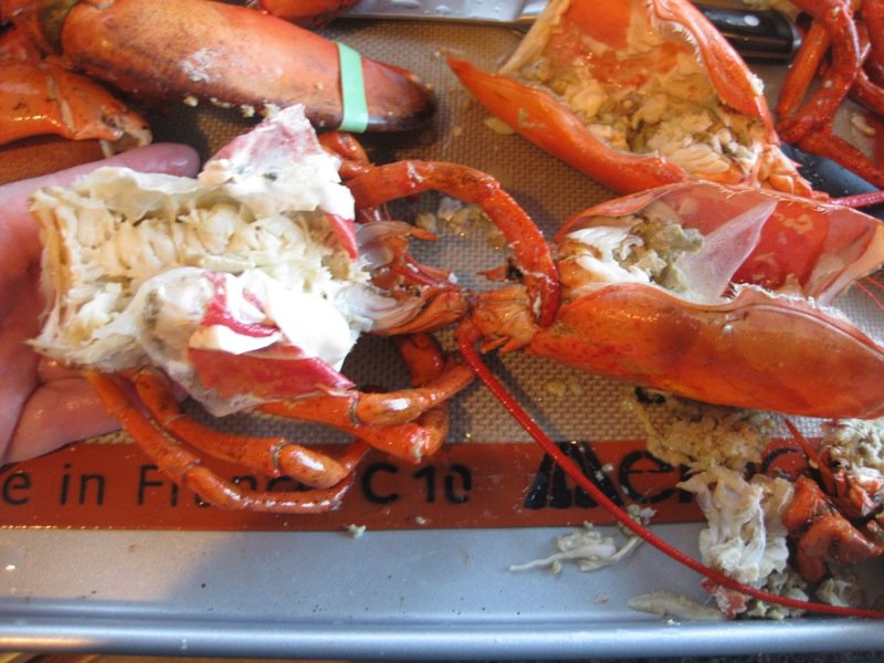 Not so easy to get the meat out. But, as the claw shells aren’t going on display, a quick smash with the side of my knife enabled me to rescue the delectable morsels. All that is left is the body and I need the legs for the “Lobster FIngers”. There is so little meat on this lobster, that there was nothing to salvage from the body except the shells and the tomalley.
