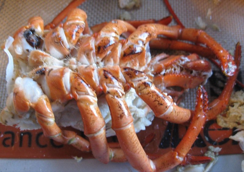 Pull the back away from the legs. Set aside the back and the tomalley to work at separating the legs for the individual presentation. Turn it over, and cut down the middle with a knife.