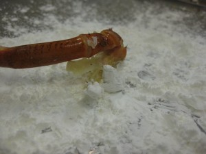 - Dust the meat end of the lobster leg into the cornstarch; gently dip the tips of your fingers into it, as well