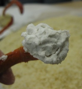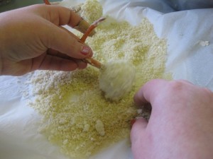 - Press the mixture firmly into an egg shape around the leg with your cornstarch covered fingers