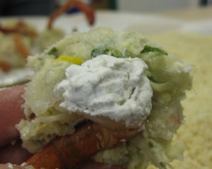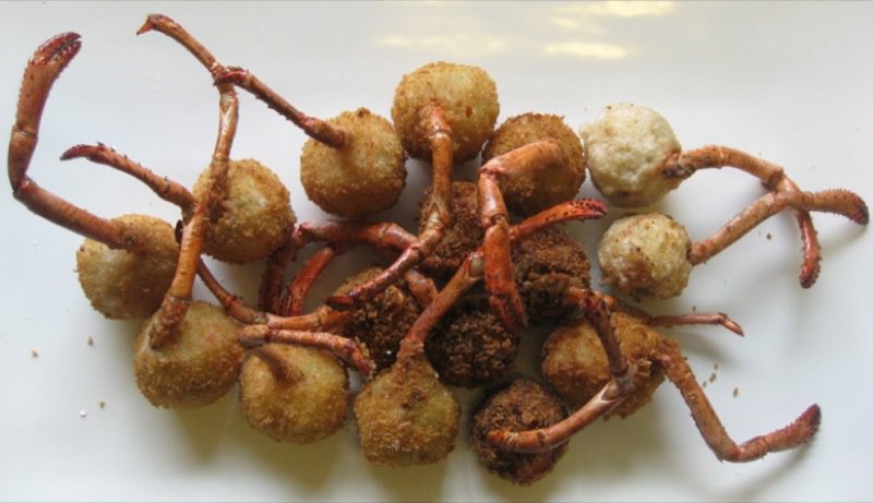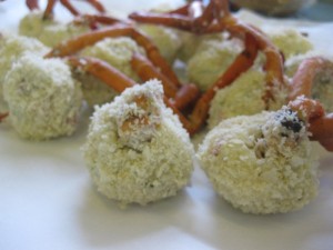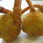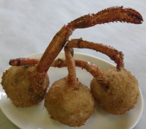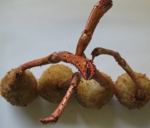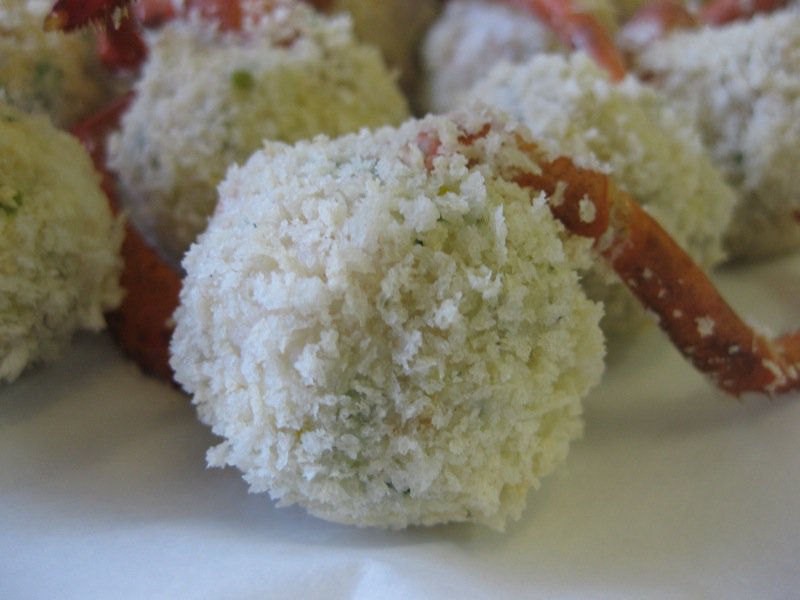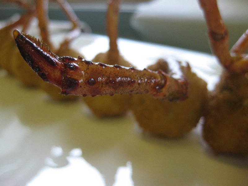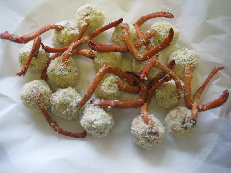 The cornstarch Adjey suggested to use on your fingers and on the end of the leg worked like a charm. The lobster mixture connected beautifully to it, and then I rolled it in the suggested panko crumbs. This is what I know one of my mistakes was. I “should have” just left the little balls enrobed in the cornstarch until all were completed, dunked them into the batter, and then rolled them in panko just before frying. I don’t have much experience with deep frying. The instructions make assumptions that you would know what to do as the batter and the panko is listed only in the ingredients of this recipe. There are no further instructions on what batter to use, or what order to do this in. I learned.