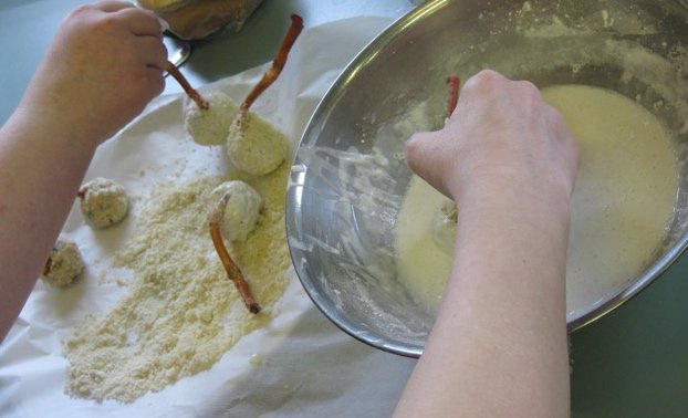 We got the oil in the frying pan to temperature; got the assembly line going. Unfortunately, all little balls had been covered with panko, so this is when we learned about what I “should have” done.