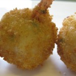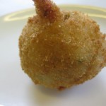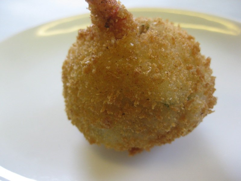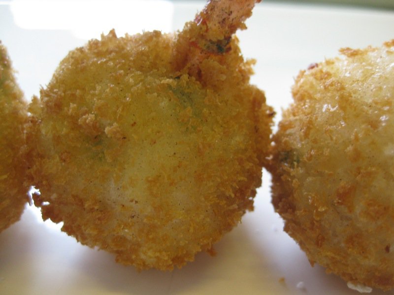 The dark ones were fried without the batter. The light ones were fried with the batter over the panko. The “just right” ones were fried with a second layer of panko over the Tempura batter. Obviously, the “crust” was going to be heavy to bite into with all the armour around this delicate little ball. Darn! It would have been light and lively had I simply left them, dipped them in the tempura and then the panko and fried them. I even think Chef A may have said I did everything perfect if he had eaten one like that. But, of course, I am not sure.