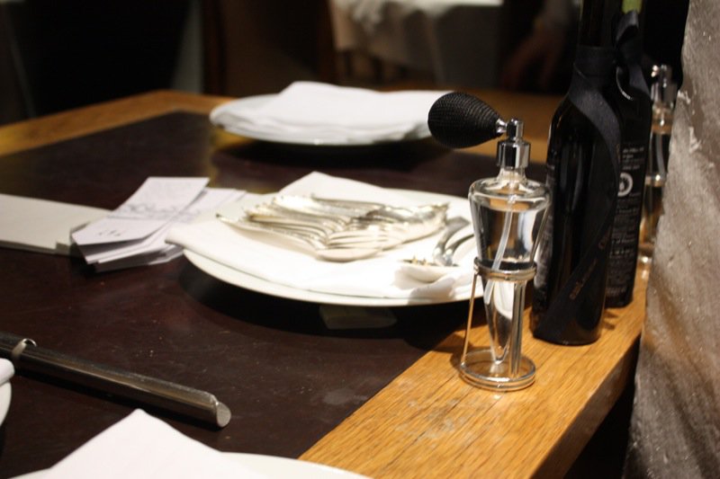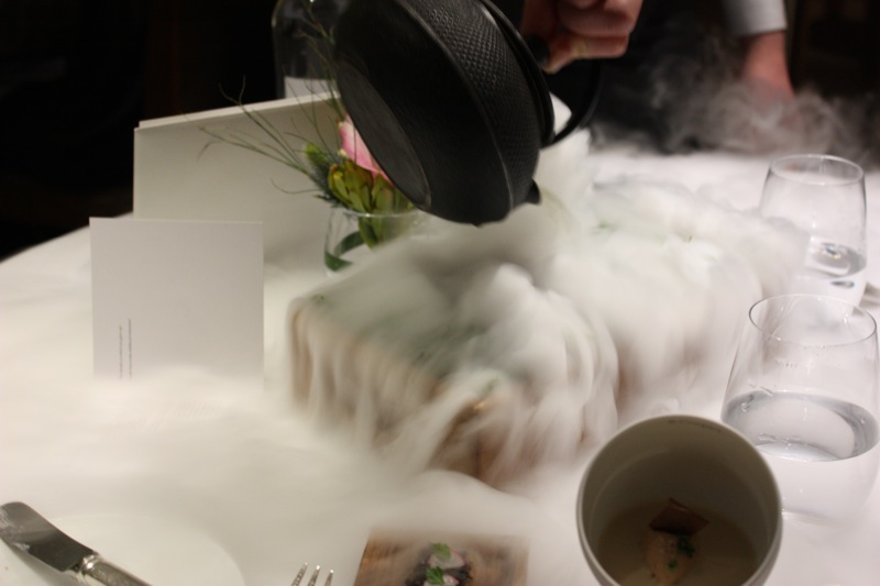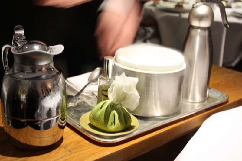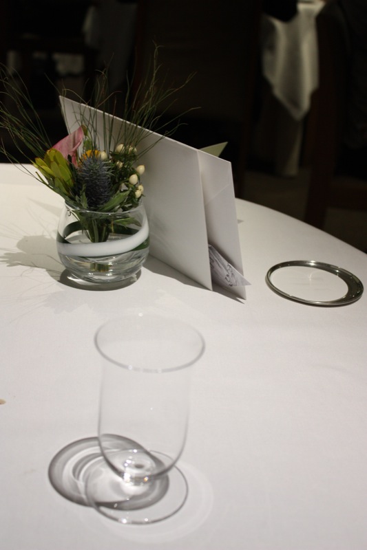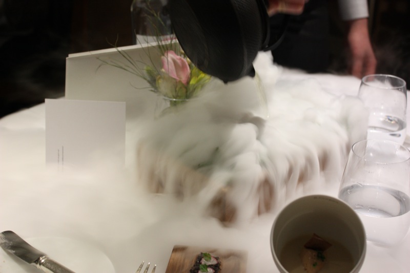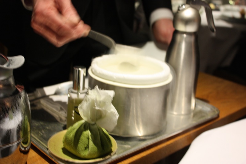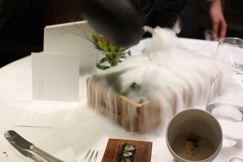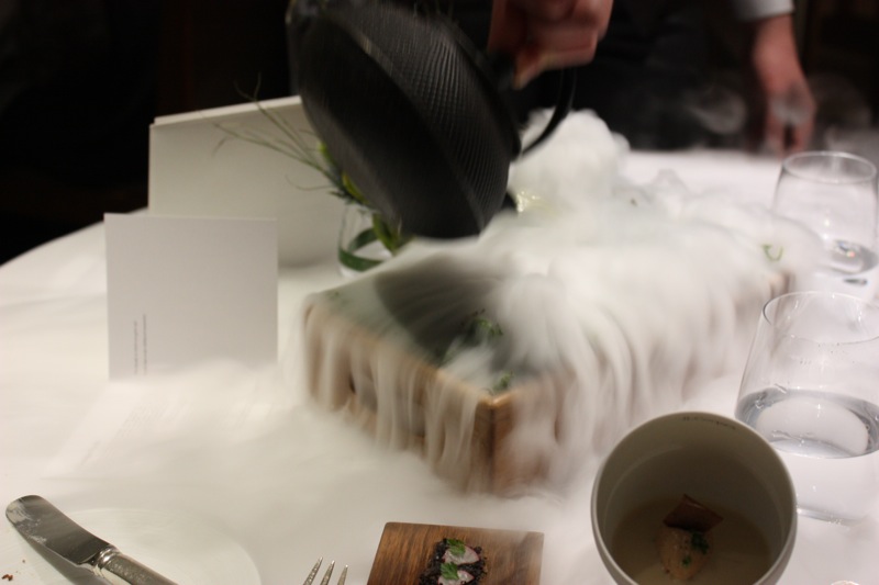 We were expecting an amuse bouche, but a gentleman in a formal jacket appeared with a tray to place on the table that had been moved into position moments before. Now this looks interesting. When we arrived, the restaurant was almost empty. The first sitting had been cleared and a few tables for the second sitting were seated so we had no idea what was in store for us.