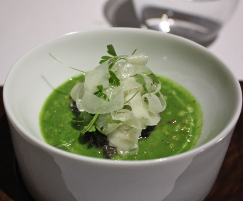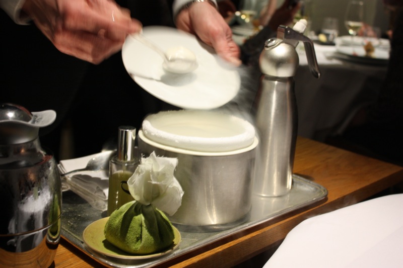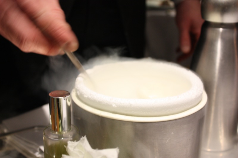 We hadn’t time to see anything served to another table and the anticipation mounted as he told us that he was about to prepare a bite for each of us with liquid nitrogen in the open pot that was -198ºF that would cleanse our palates and prepare us to dine .
