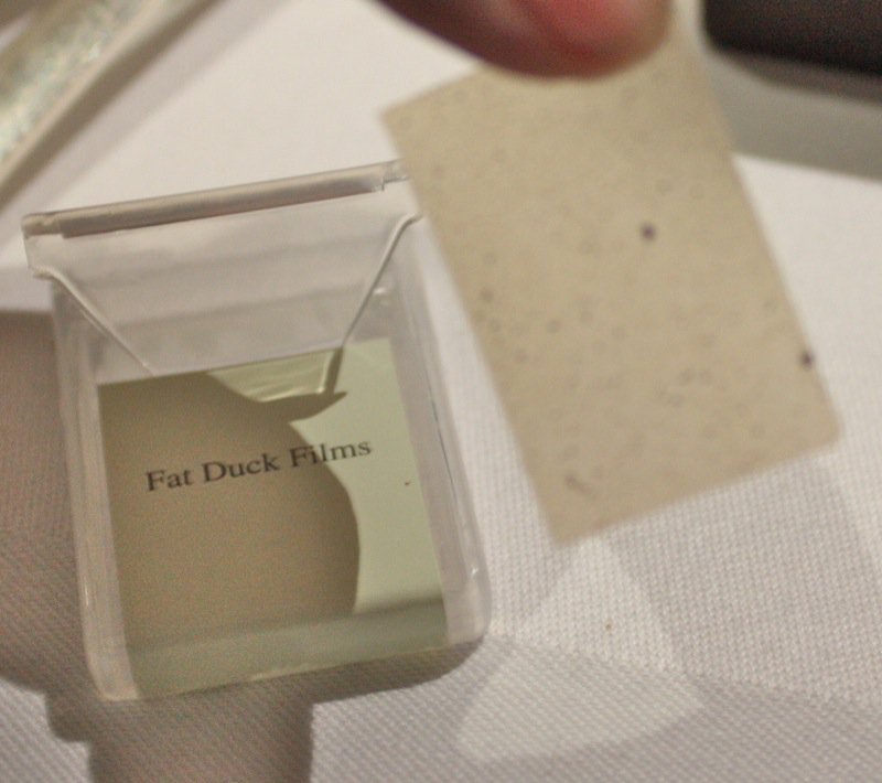 As a server placed it on the black slate on our table, we were told it was unpasteurized salted butter. This seemed to be a recurring theme. Again, I could not get enough of it. It was only butter, but nothing at The Fat Duck is usual. This butter was clean and salty and creamy. I could have taken a spoon to it. Instead, the bread was perfect. They should sell it to take home.