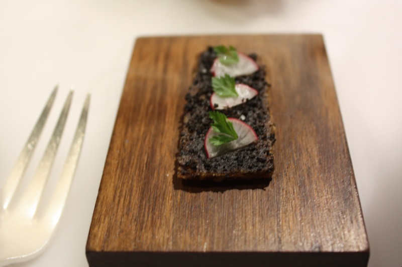 …bubbling over the table to greet us as we partake of the mossy oak jelly and cream. It cannot be explained, but it was exceptionally delicious. This was one of my favourite taste and texture experiences of the evening. The chicken liver was silky and thick and unctuous and the lighter layers inside of the bowl rounded that richness into such a pleasurable delight. I almost forgot I had a truffled cracker. Who could forget that? And it was earthy and chewy and crunchy and the perfect textural compliment to the bowl of velvet silky jellied perfection. Simply perfect.