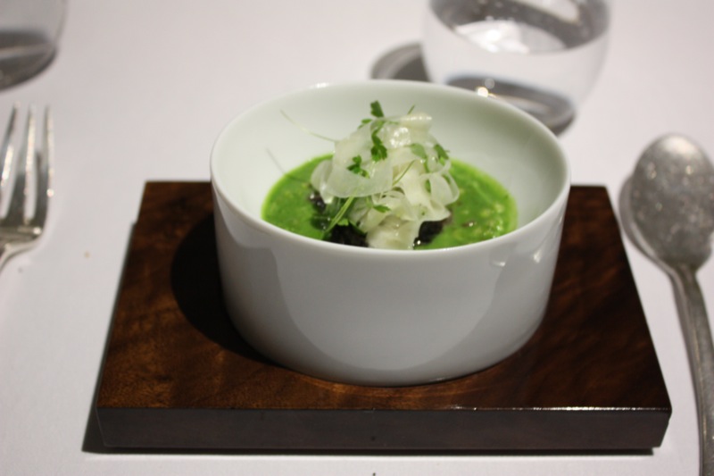 Before we got very far into our tasty whole grain bread, a canelle of mustard ice cream was served with a red cabbage soup. The intensity of the soup was unexpected and exceedingly pleasing. Chef Blumenthal, how do you come up with such ideas? It was refreshing, savoury, sharp, and completely unexpected. The flavours paired perfectly. Who would have thought? Heston Blumenthal. Simply perfect.