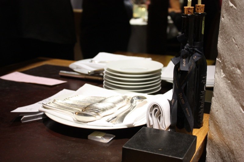 As we were seated directly in front of the service preparation table, it was interesting to watch perfect synchronicity of the service staff. Someone from the kitchen would bring out a tray of food for service and place it on the table. Whoever was closest and available would immediately come to the tray, read the little note under it (still on the photo to the left, above) and then take it to the correct table. Depending upon which course it was, and how many people were at the expecting table, others may join in the service. It happened as perfectly as a well practised dance and was definitely enjoyable to watch.