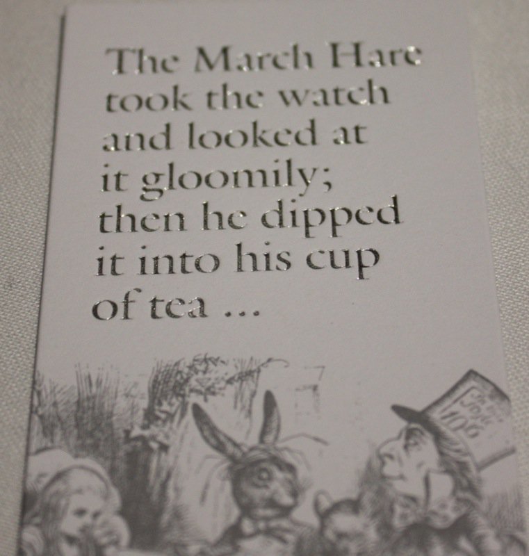 The March hare took the watch and looked at it gloomily; then he dipped it into his cup of tea… “Have you seen the Mock Turtle yet?” “No”, said Alice. “I don’t even know what a Mock Turtle is.” “It’s the thing Mock Turtle Soup is made from,” said the Queen.