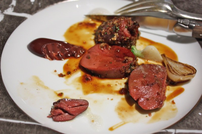 I had heard “humbles”, and asked, “What are humbles?” The young man blushed just a bit and said, “Offals?” I nodded and then said, “Which?” “The heart.” I was looking forward to tasting that. I was always the one at our family dinners that would scramble for the turkey or chicken heart as a child. I believe that love was instilled by my grandma Maude who would whisper to me, “Make sure you’re the one to get the heart when the plate comes around. It is always the best part of the bird.” I would chew on the rubbery bits proudly, and learned to love them. This heart was so tender. How tender it was actually surprised me. Is that the pigeon, or the chef? It is the heart shaped bit in the above photo. It was very delicious.