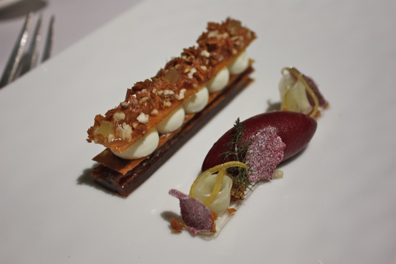 There was a lot going on in this dessert. I was sure I tasted violet. The server assured me it was rose, but I tasted violet. I wonder why? What was it, Chef Blumenthal, that brought that taste memory forward for me? The crunchy pastry and rose scented cream with the lemon bits and the cassis sorbet… all heaven. And I was really ready for a sweet treat by this time. The rose petals must have been made in house as they are just like the ones I make and nothing like the commercial ones in the South of France. There was a gelatin layer in the tart that created yet another layer of texture. Gorgeous, and yummy. No so simple. At all. But, perfect.