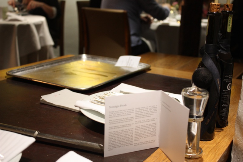 A bookmark arrived in the middle of our place setting. Not just any bookmark. A bookmark made with exceptional cardstock, letters embossed in silver and with The Fat Duck’s signature knife, fork and spoon raised proudly at the bottom in sparkling splendour. Anticipation. An invitation.
