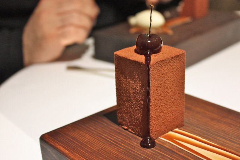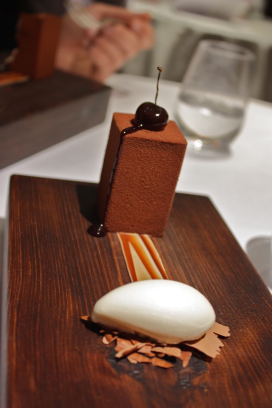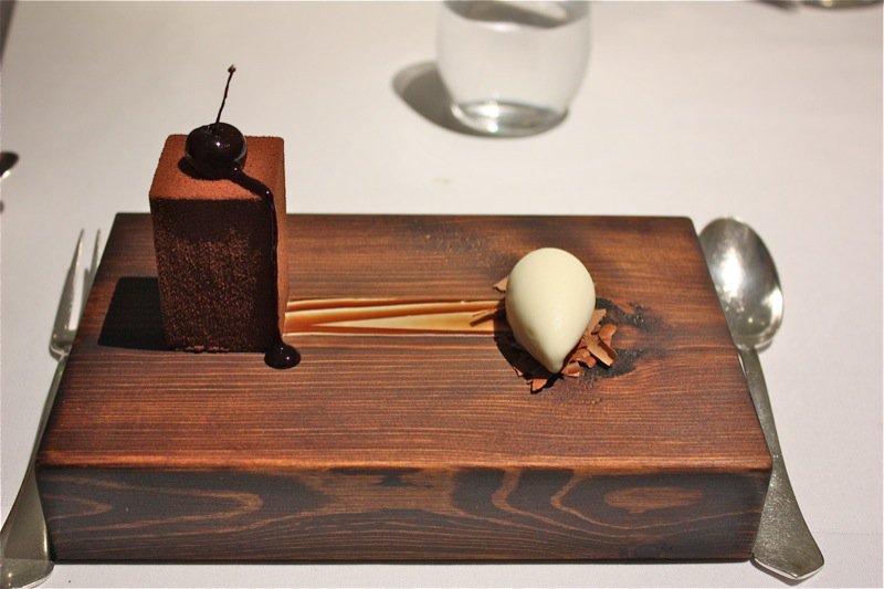 I cannot imagine how Chef Blumenthal creates such complex and intense delights to appear so simple. Certainly, many of his dishes are not, but all possess a clarity that is compelling. Here, our gateau, stately erect in all its decadent splendour. The ice cream was my first bite and almost brought me to my knees. There is no photo of the interior of this cake as I was not thinking about anything else during this eating, tasting, smelling, and self indulgent experience. The cake was more cream filled that cakey. It was layered with three other cherry-crowned layers hiding within cream and chocolate and cakey goodness that cannot be described as most of us have no frame of reference for the quality of food that this Chef and his staff create. Unforgettable. Brilliant.