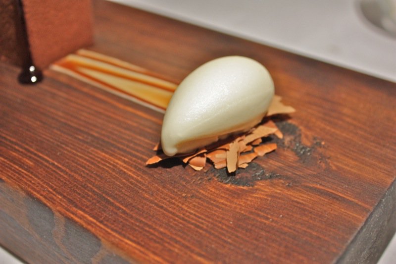 The salmon poached in licorice was wrapped in a licorice gel, and poached. It was topped with trout roe and was very clean and clear in flavour. The trout roe burst little sparkles of salty sea fireworks over the salmon. Here, the grapefruit tendrils really elevated the taste experience as the citrus notes cleansed my palate. At the same time, the decadence of the seemingly decorative vanilla mayonnaise played a very important role in this dish as it brought the artichoke and the salmon together as the perfect pair. Vanilla mayonnaise is scrumptious! I loved this succulent dish. Not so simply perfect.