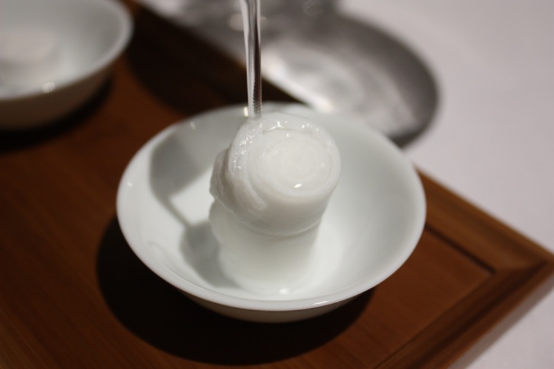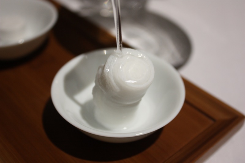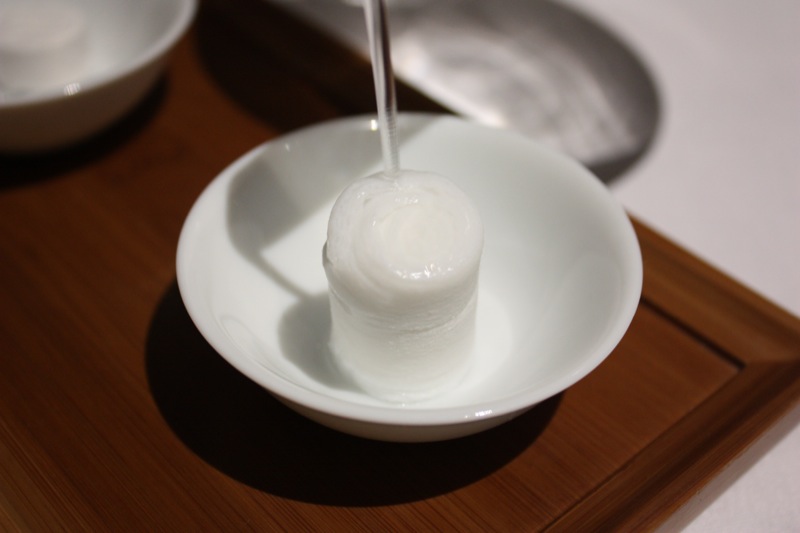 Our hot and cold tea arrived next. Heston Blumenthal, how do you do what you do? This was pure magic in a see-through glass. Magic. One sip was hot, the next, cold. One sip cold, the next hot. The latent scientist in me kicked into action. Hmmm… density of solutes… gelatin… emulsion… how did he do this? It has to be something to do with gelatin and ice and hot water. The flavour, I should add, was a refreshing mild honey tea and the texture was unusual… or was it just the temperature change playing games with my palate? This really was a Wonderland. Magical.