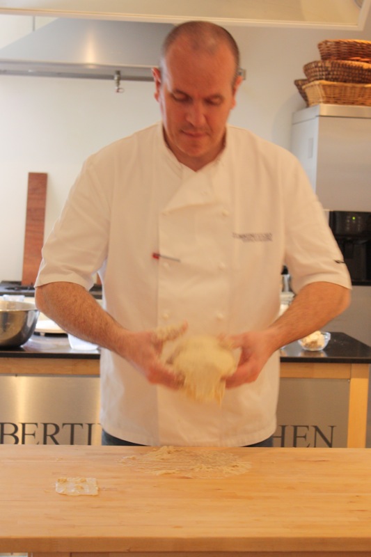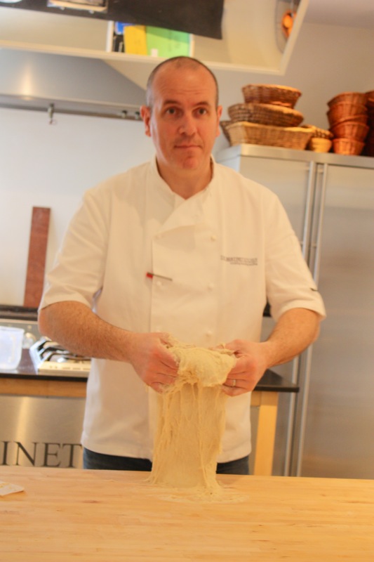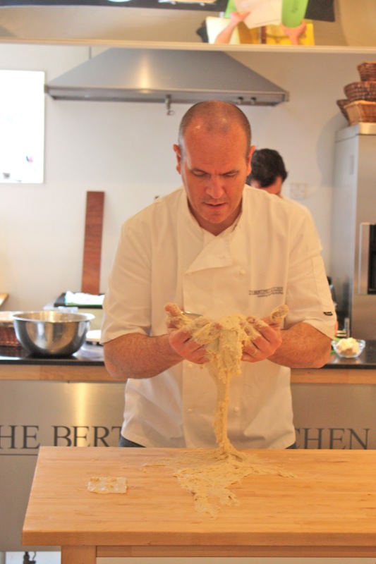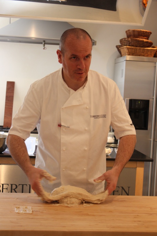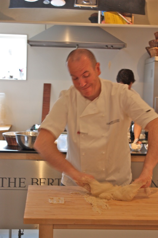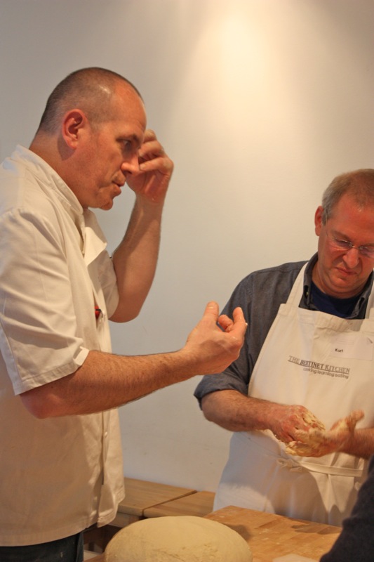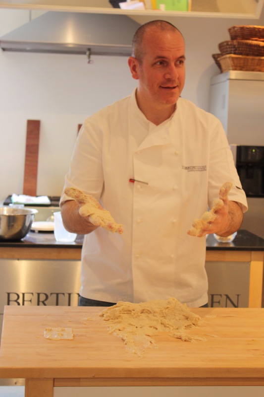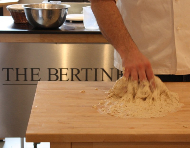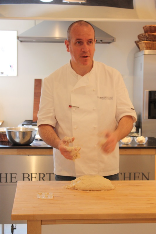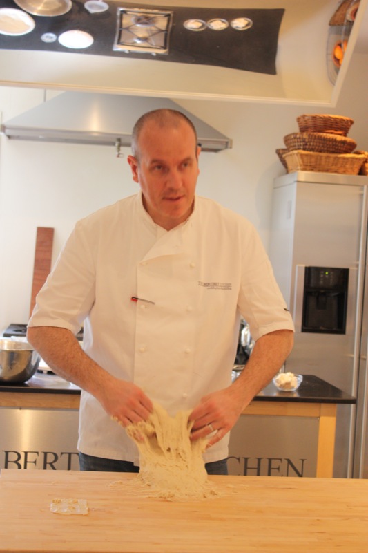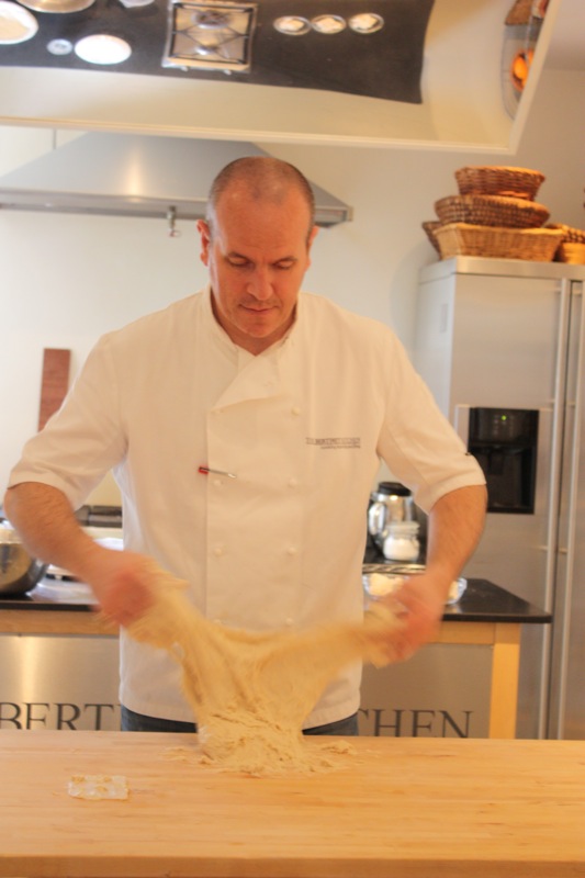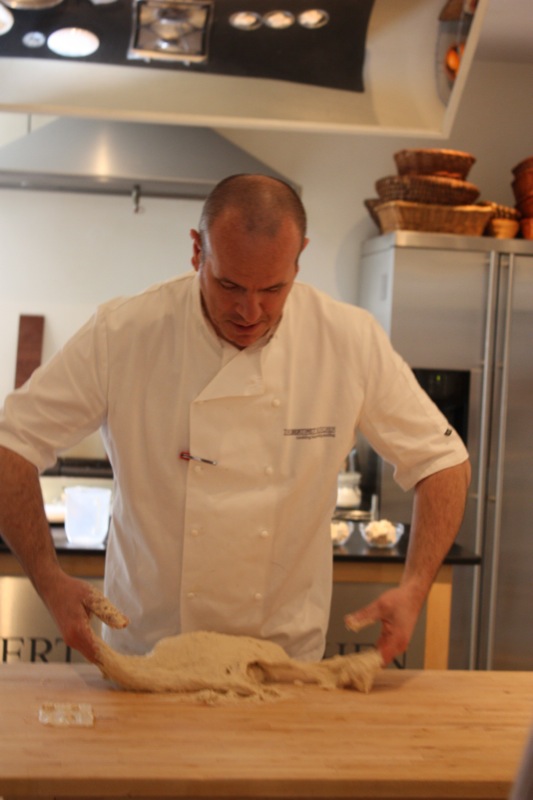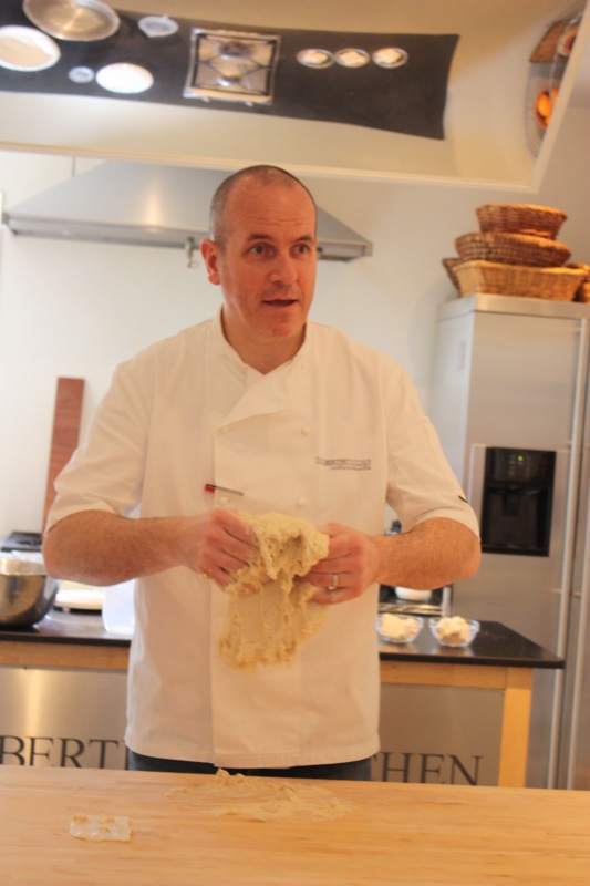 And we did. We stretched and worked our dough and got stuck and sticky and sticky and stuck. Then, Richard Bertinet stopped by our table to praise our efforts, point out our good deeds and correct our flaws. Bend your knee. Place your weight here. Don’t work so hard. Be in control of your dough. Rock on your feet and pull back through your shoulders. Get into the groove. Listen to him and watch him on the video. I thought I was moving as he instructed, but he just placed his hand on my shoulder and it was clear I was tense and not relaxed in my movements. And that one touch changed everything in the way I moved through my dough working motion. And his tip about my thumbs. “Keep them up here. Not over there.”