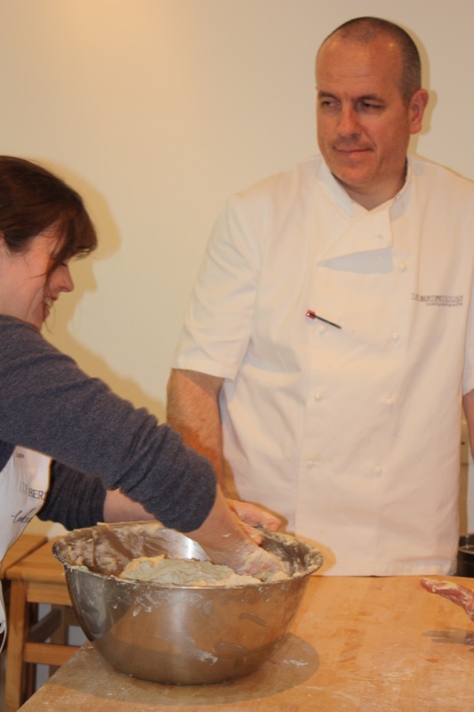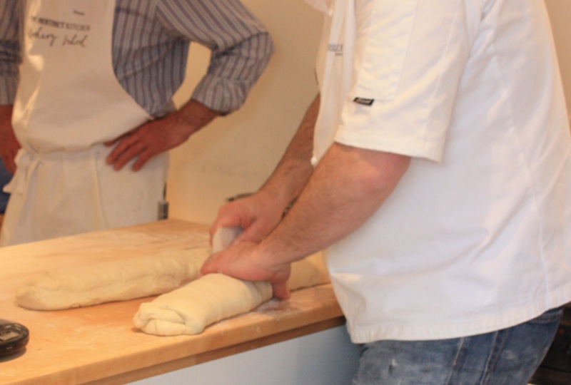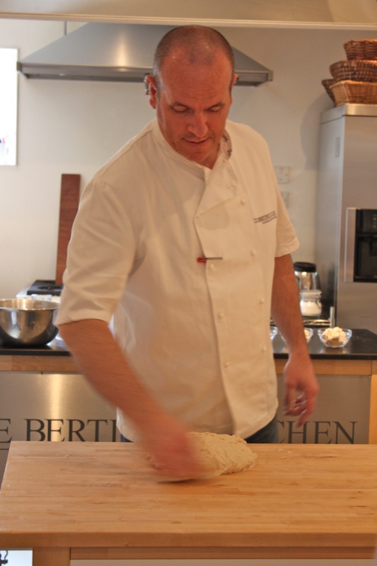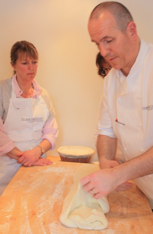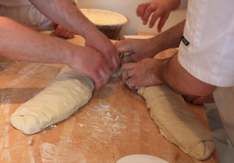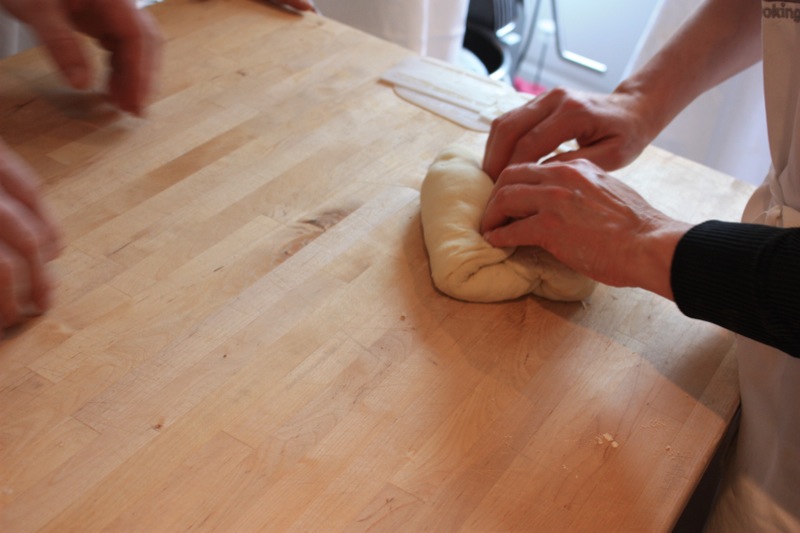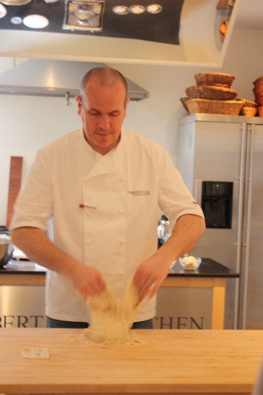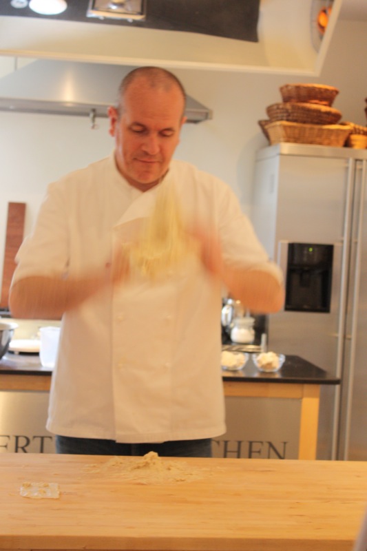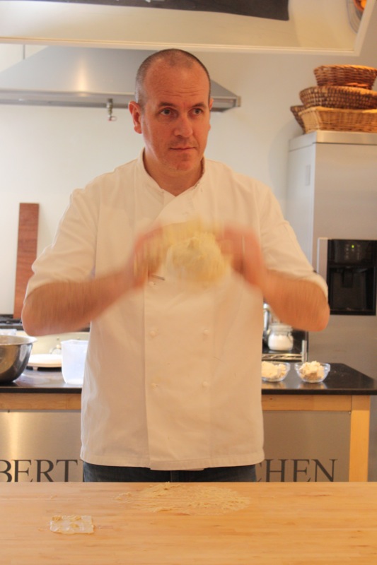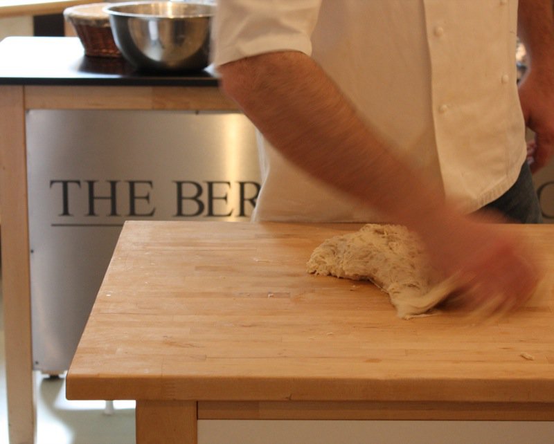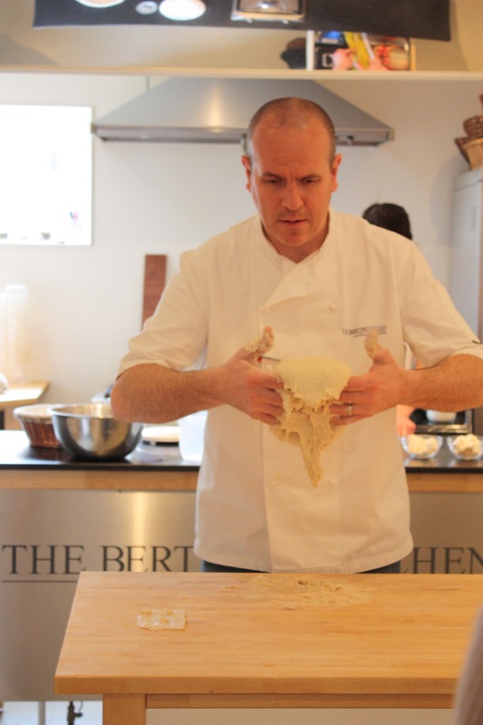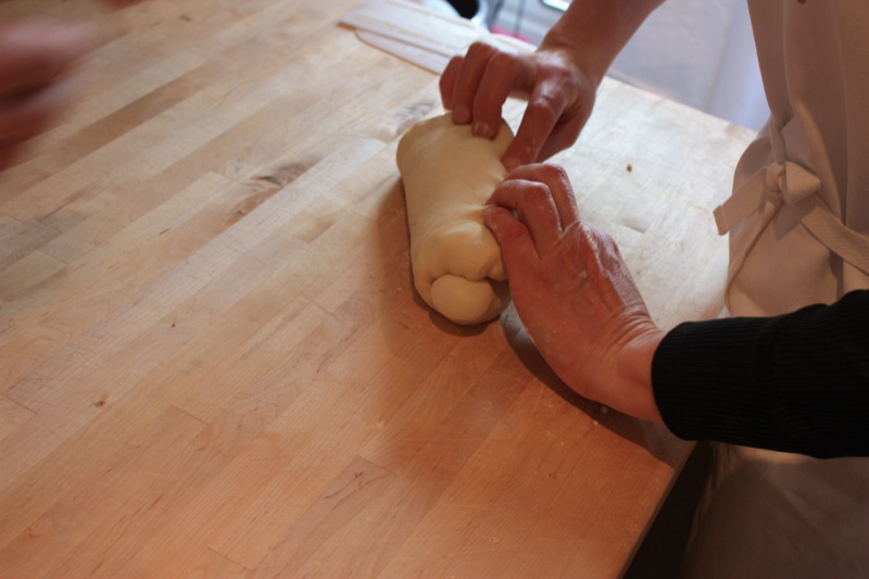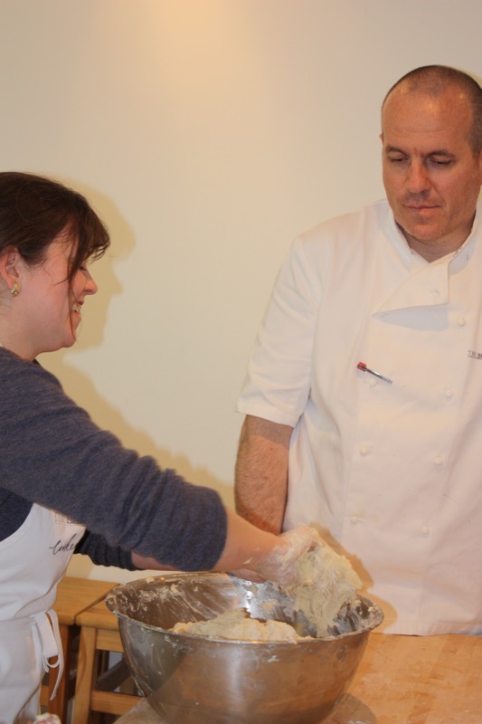 And we did. We stretched and worked our dough and got stuck and sticky and sticky and stuck. Then, Richard Bertinet stopped by our table to praise our efforts, point out our good deeds and correct our flaws. Bend your knee. Place your weight here. Don’t work so hard. Be in control of your dough. Rock on your feet and pull back through your shoulders. Get into the groove. Listen to him and watch him on the video. I thought I was moving as he instructed, but he just placed his hand on my shoulder and it was clear I was tense and not relaxed in my movements. And that one touch changed everything in the way I moved through my dough working motion. And his tip about my thumbs. “Keep them up here. Not over there.”