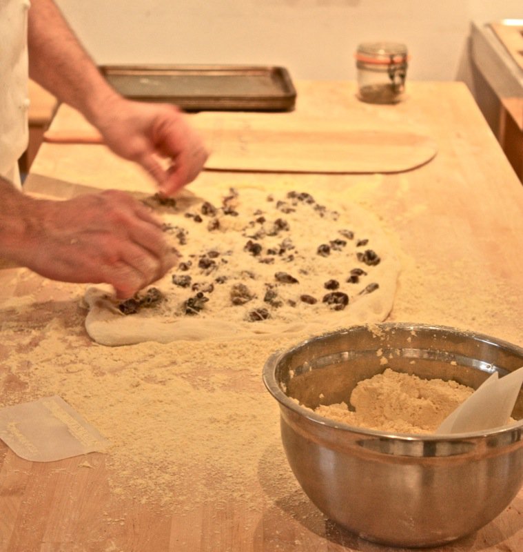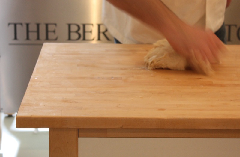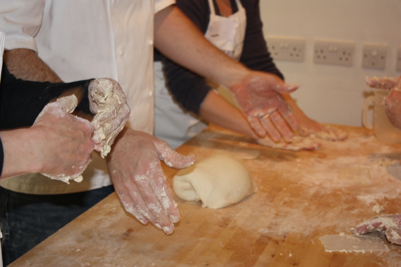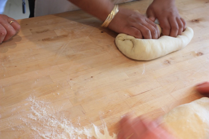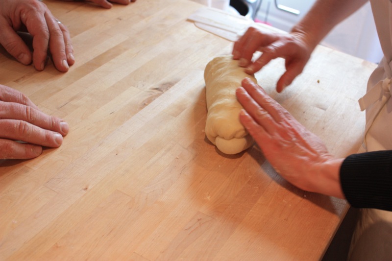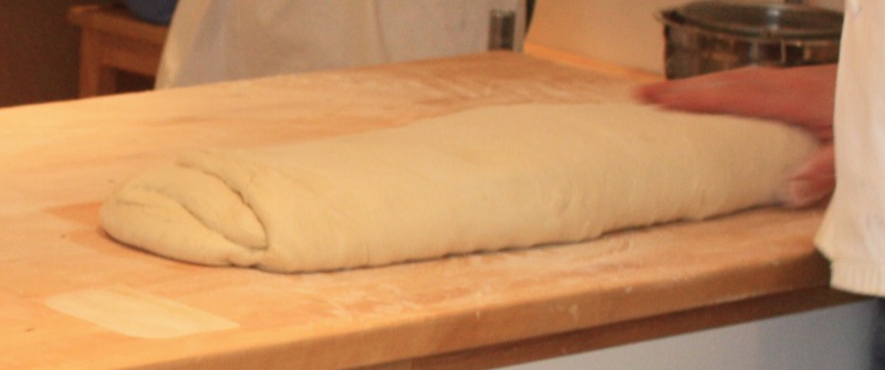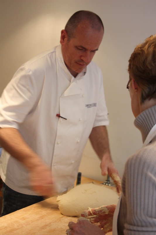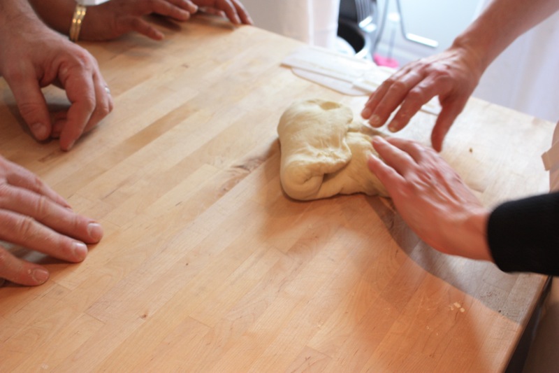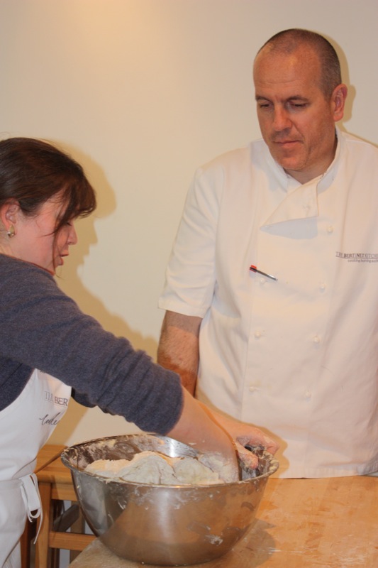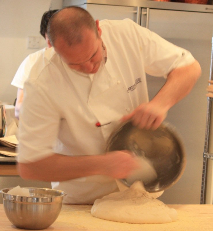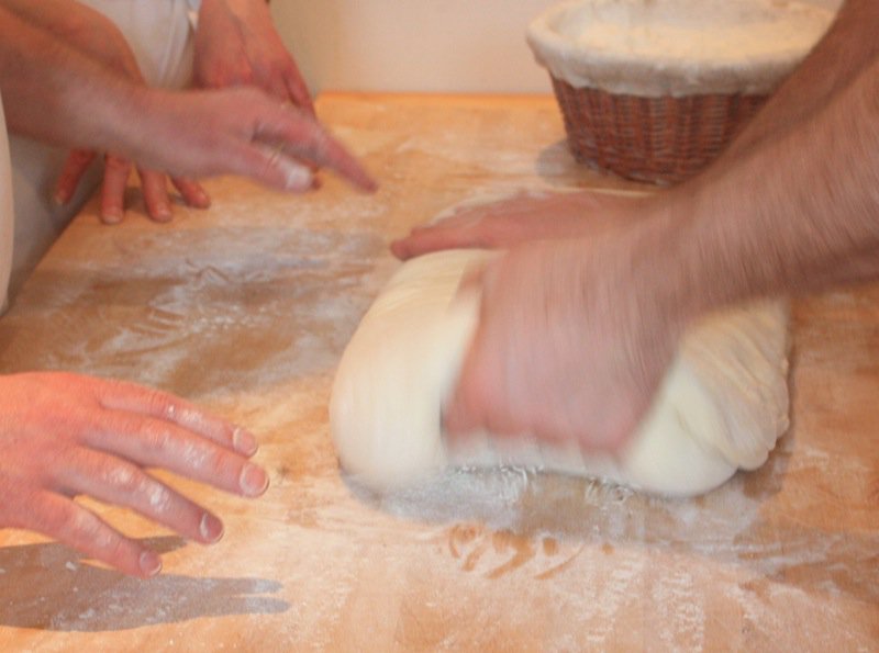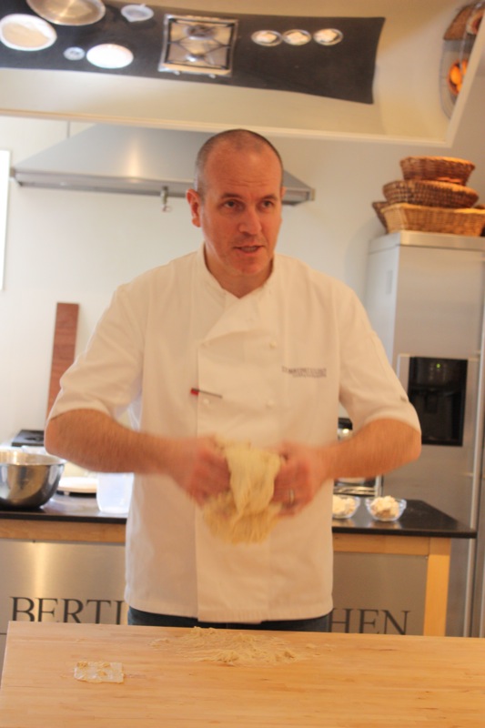 And we did. We stretched and worked our dough and got stuck and sticky and sticky and stuck. Then, Richard Bertinet stopped by our table to praise our efforts, point out our good deeds and correct our flaws. Bend your knee. Place your weight here. Don’t work so hard. Be in control of your dough. Rock on your feet and pull back through your shoulders. Get into the groove. Listen to him and watch him on the video. I thought I was moving as he instructed, but he just placed his hand on my shoulder and it was clear I was tense and not relaxed in my movements. And that one touch changed everything in the way I moved through my dough working motion. And his tip about my thumbs. “Keep them up here. Not over there.”