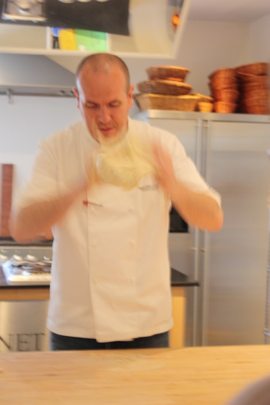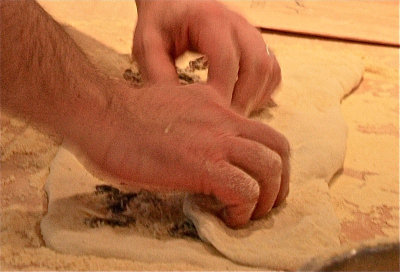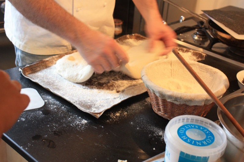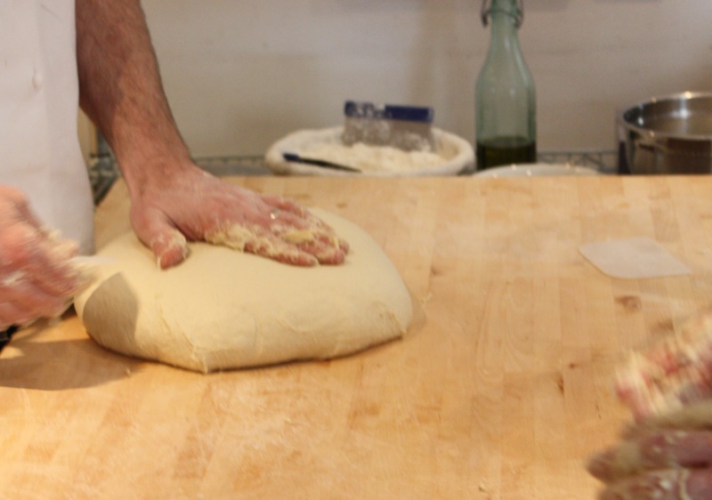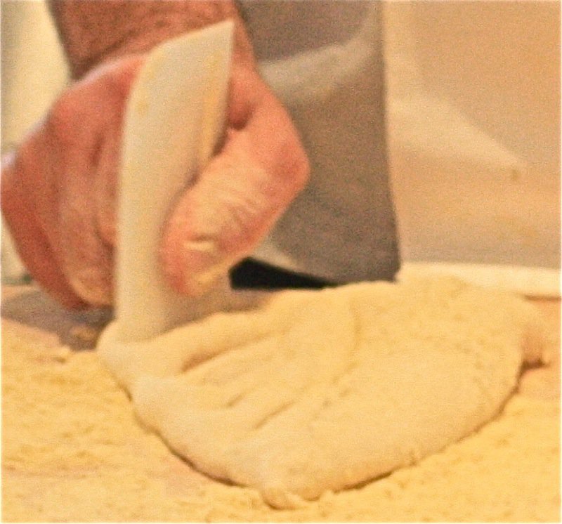 And then he picks it up with the bottom, or sticky side, away from him, his thumbs carefully positioned, and works the dough on the counter. You can see the exact technique n motion in the following video. Watch for his thumb placement. That is important and his repositioning of my thumbs helped a great deal. “You are in control of your dough. Your dough is not in control of you.”