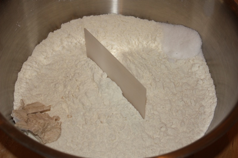 Richard placed the yeast on one side of the bowl, and the salt on the other. He rubbed the yeast into the flour, then mixed the salt into it, added the water, and is now mixing it to make dough using his left hand to turn the bowl and his right hand, holding the plastic spatula, as the bread hook.