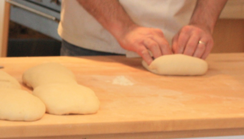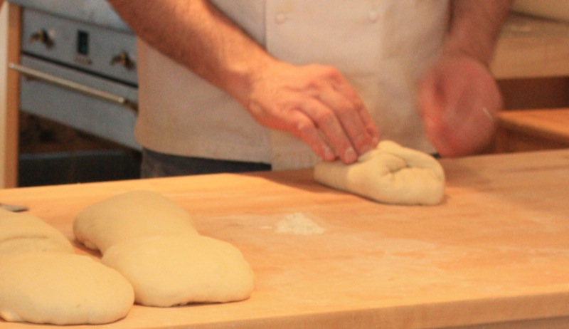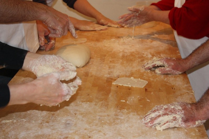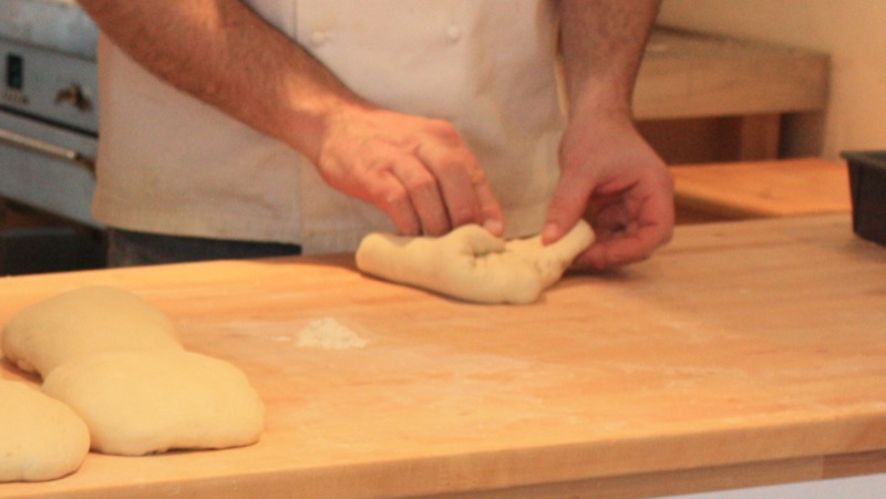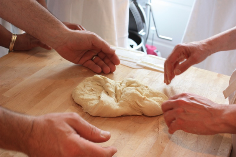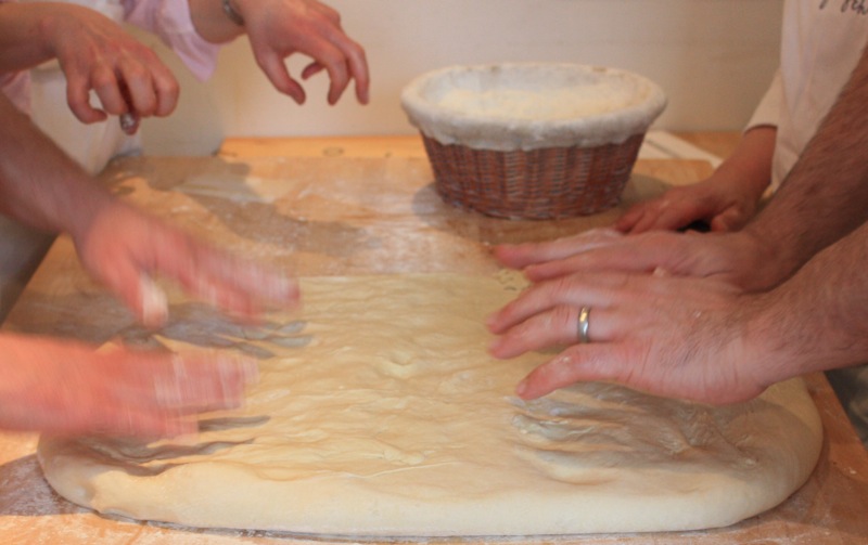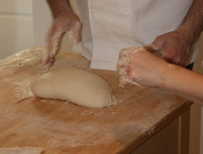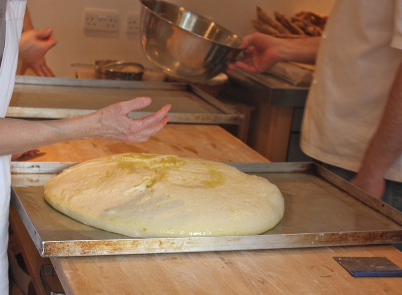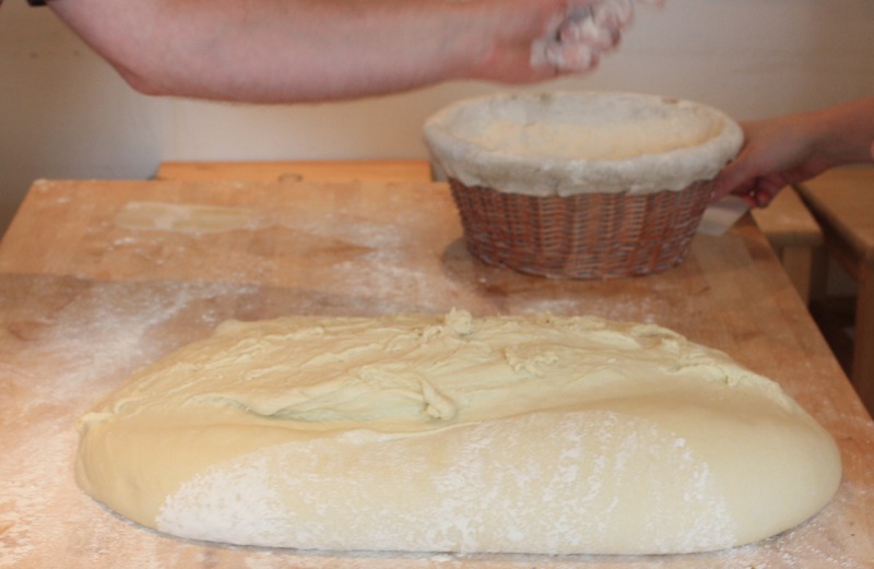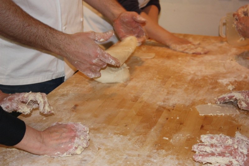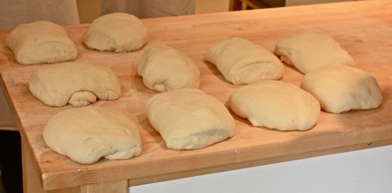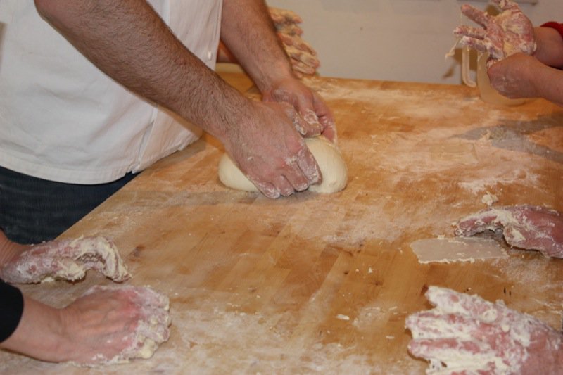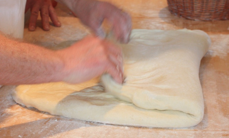 Now our first bread has proofed and is ready to work with. We are making fogasse. I have tried to make fogasse already, at home, when I first got this book. I was not successful. Yet, I had tried and tried. I do learn best by doing and being shown.