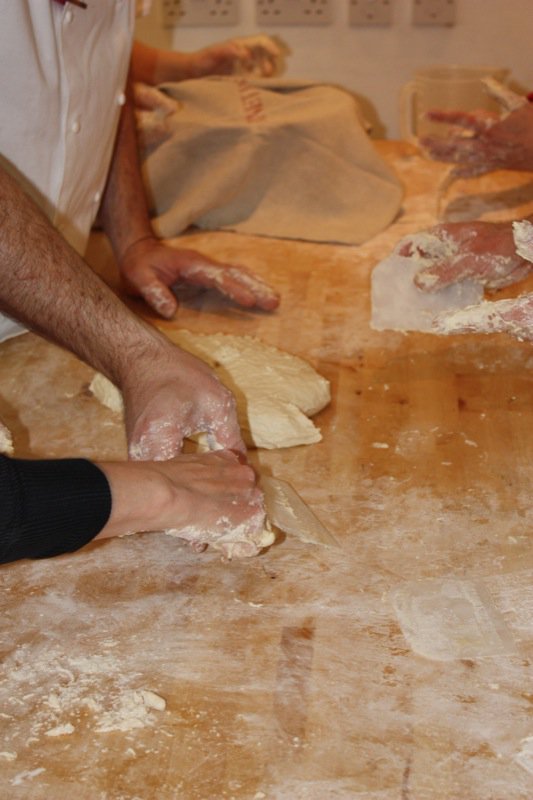 Look at the gorgeous, soft bowl of proofed dough (three kilos of flour was in this batch). Carefully, with his spatula, Richard eased it out of the bowl and then proceeded to cut the entire puddle of dough, very precisely and confidently, in half. One for you, and one for me. He had everyone make Fougasse, and then two tables made bread sticks while one table finished the Focaccia.