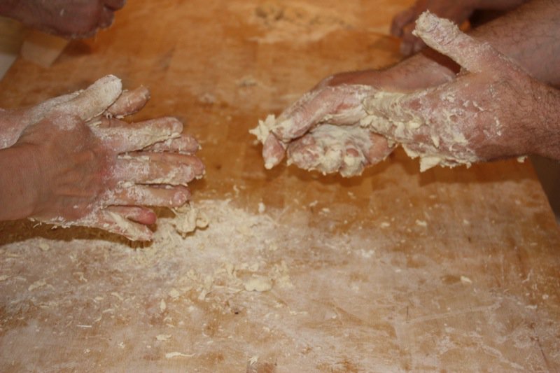 The metal scrapers were pulled out for cleaning the counter tops. No water. A little more flour. Just a little. Rub it in. Rub the dough off, and scrape it all into the garbage.