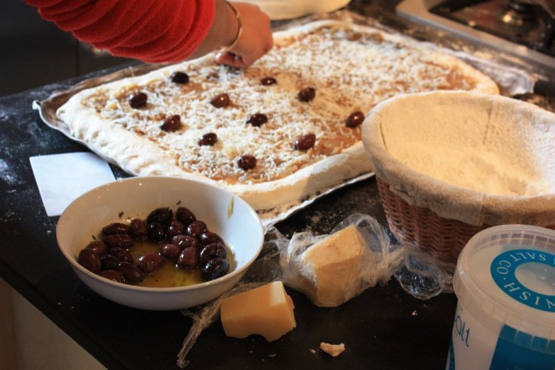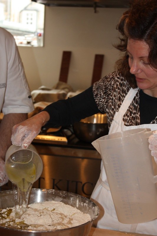 Sophie and I were working together on this one. She dumped the olives into the bowl and I then took the pits out and roughly tore them apart with my hands while she shredded the Pecorino cheese. We weren’t sure what we were making at the time. Some kind of scrumptious bread lovely extra virgin olive oil, Kalamata olives and Pecorino cheese… who cares exactly what. We just happily did what we were told taking in the salty aromas and loving every minute of it. I believe we have 3 kilos of flour in this bowl, so the batch would be 6 times the ingredients listed. “It is just as easy to work 3 kilos of dough as it is to work one kilo of dough, so I will have you learn that now.”