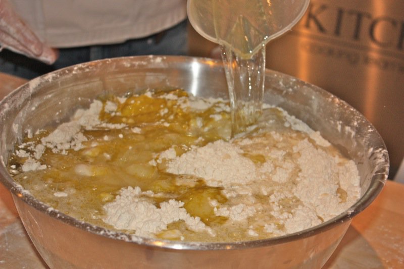 After the water is mixed into the flour, he dumped the mixture onto the work surface and then talked about the difference between kneading and working the dough. “The dough is very sticky. That is what the dough should look like.”