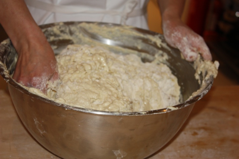 And, voilà ! C’est fini! The soft, supple and beautiful dough is placed to rest in the same bowl it was first mixed in with a cloth on top, in a warm little nook by the stove. And, Richard proceeds to clean his hands on his work surface. “My boss would kill me if I ever wiped my sticky dough hands on his towels or washed this down his sink.” You must us the work surface to clean your hands by rubbing them together with a little flour from the table and the dry bits left to clean the table, as well. Then, scrape the table and rub your hands over the garbage until every last bit of dough is free from both.