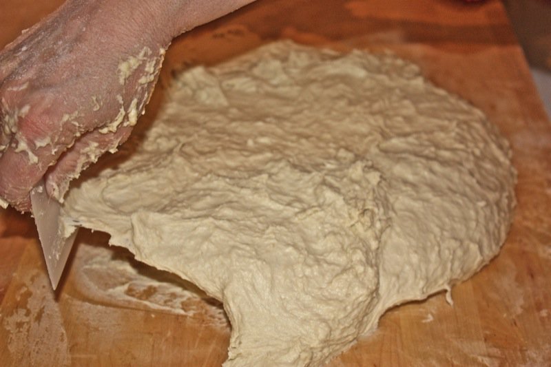 The top is not sticky. The bottom is sticky. When you work the dough, take it in your hands with your thumbs on the top where it is not sticky and place your 4 fingers under it on the sticky side to life it up. Pull it up and toward you, stretching the dough out to fill it with air and slap it down on the table and lift it again: stretching and pulling and inflating the dough with air. When the dough is getting less sticky, pull your hands right away from the sides and turn it 90º before you pick it up to pull it and stretch it and fill it with air again. After about 4 times, use the spatula to form it into a ball. “Take the dough for a walk” with your spatula (roll it around the work area with the spatula never leaving it). And now, it is done and needs to rest.