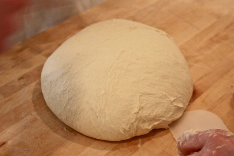 How do you know it is done? Take your “dough for a walk” with your spatula. Move it around your work surface without removing the spatula from under it, the same way you would use the spatula to form the dough into a ball. Never take the spatula away from under the dough. When there is nothing sticking to the counter when you “walk your dough”, it is done.